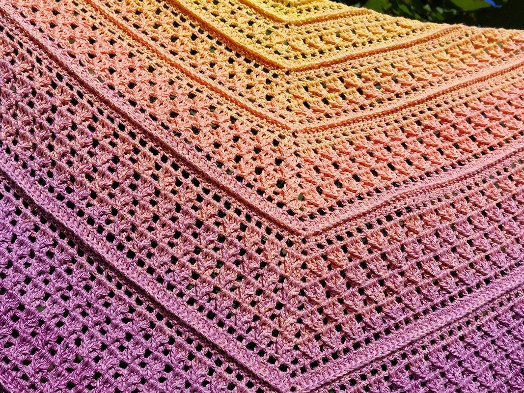 Diese Häkelanleitung ermöglicht es, ein flaches Dreiecktuch mit nur 6 wiederkehrenden Reihen zu häkeln – es ist also absolut fernsehtauglich. Die Mustersätze können mit dem neuen Muster immer breiter werden, aber auch in gleichbleibender Breite gehäkelt werden. Wer die Zwischenstreifen nicht mag, kann diese auch einfach weglassen und nur mit den zwei wiederkehrenden Reihen 8 und 9 das ganze Tuch problemlos häkeln.
