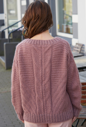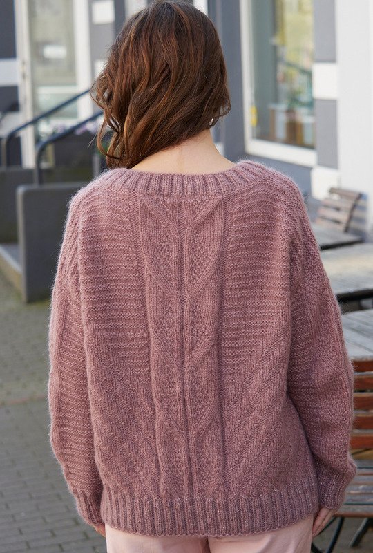 DIeser großeartige und kuschelige Pullover besitzt eine tolles Muster, das gar nicht schwer ist aber gleichzeitig beim stricken niemals langweilig wird. Mit diagonalen Rippen und geschickten Zu- und Abnhamen entsteht ein interessanter Effekt, welcher der Figur schmeichelt und das zarte Mohair- und Alpakagarn perfekt zur Geltung bringt. Die Pailetten im Garn sorgen für einen dezenten Glitzereffekt. Gestrickt wird hier zweifädig mit der Nadelstärke 5. Alle Teile werden einzeln von unten nach oben gearbeitet und später zusammengenäht. Durch den geraden Schnitt kann man sich perfekt auf die verschiedneen Muster konzentrieren. Diese sind in der Anleitung dank ausführlicher Strickschriften super einfach nachzuarbeiten.