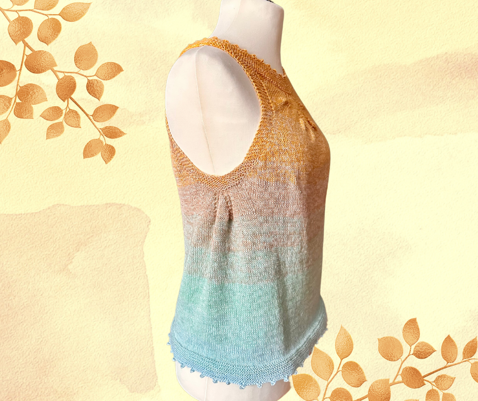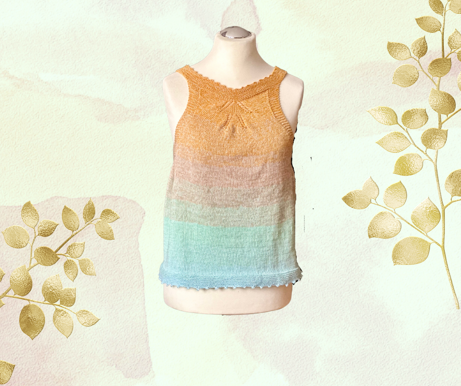 Das Top wird top - down gestrickt. Du wirst mit einem zarten Pikotanschlag beginnen, der dem Top eine edle Note verleiht, und am Ende mit einer ebenso eleganten Pikotkante abschließen – beides mithilfe einer Häkelnadel.