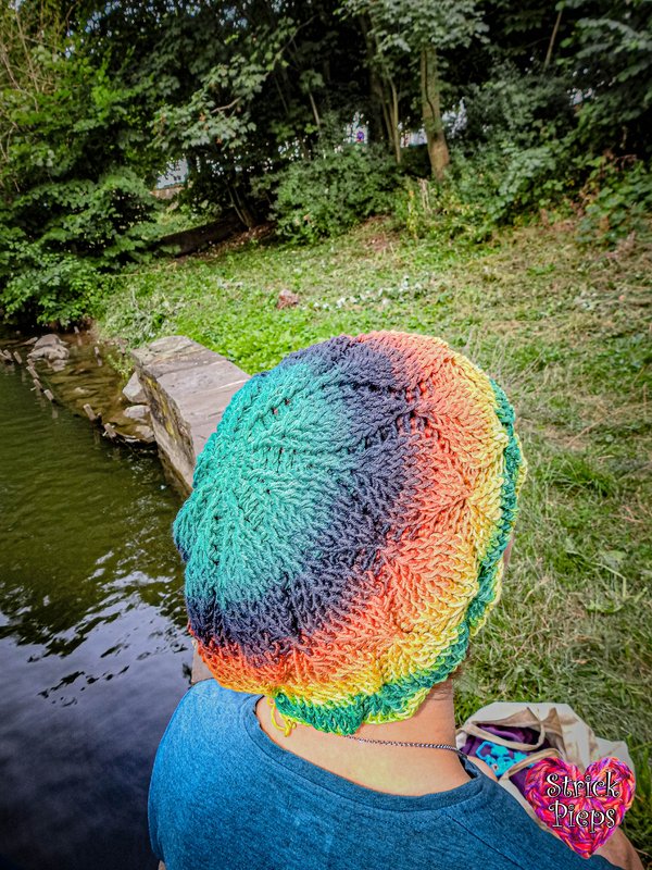 Dies ist eine Anleitung für eine Häkelmütze in 3 Größen, die mit Reliefstäbchen gefertigt wird, was zu einem schönen plastischem Muster führt.