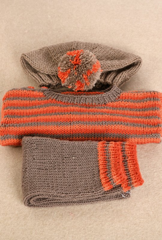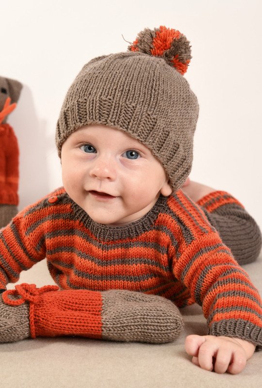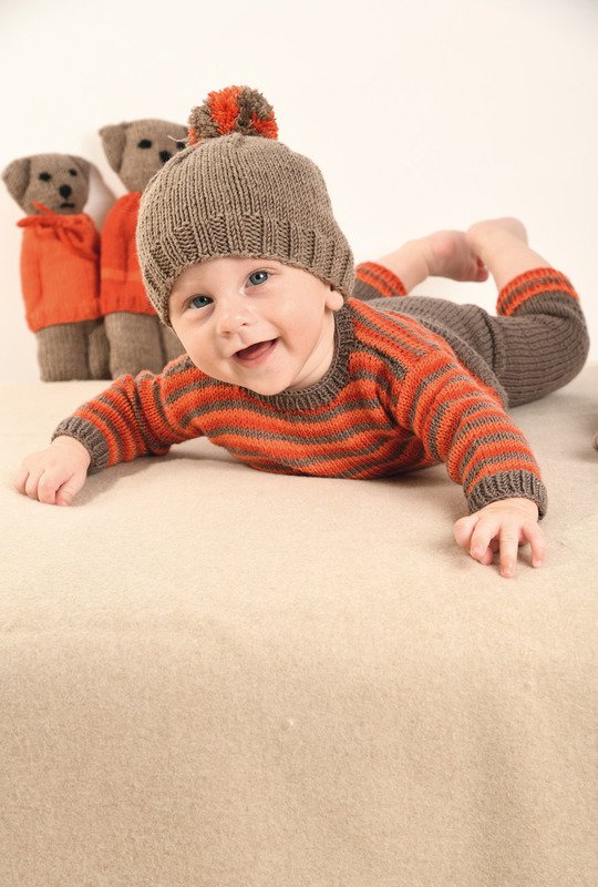 Dieses Set aus Pudelmütze, Pulli und Hose ist nicht nur supersüß, sondern auch sehr bequem. Im Übrigen sehen zur Grundfarbe Graubraun-Meliert auch viele anderen Farben hübsch aus, so kann der Pulli oder immer wieder anders gestrickt werden. Gestrickt wird mit 100 % Schurwolle **glatt rechts, glatt links und im Rippenmuster. Passend dazu wird noch eine süße Kuscheltier-Teddyfamilie gestrickt. Ihre Form bekommen die Teddys im Nachhinein durch Abnähen der Konturen. Mit diesen ausführlichen Strickanleitungen inkl. Schnittmuster lassen sich der Pulli in den Größen 56–80, die Mütze für 34–39 cm Kopfumfang** und die Teddys, 27, 24 und 22 cm groß, problemlos nacharbeiten.