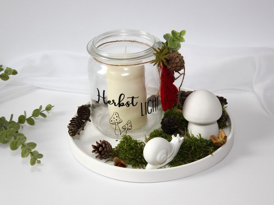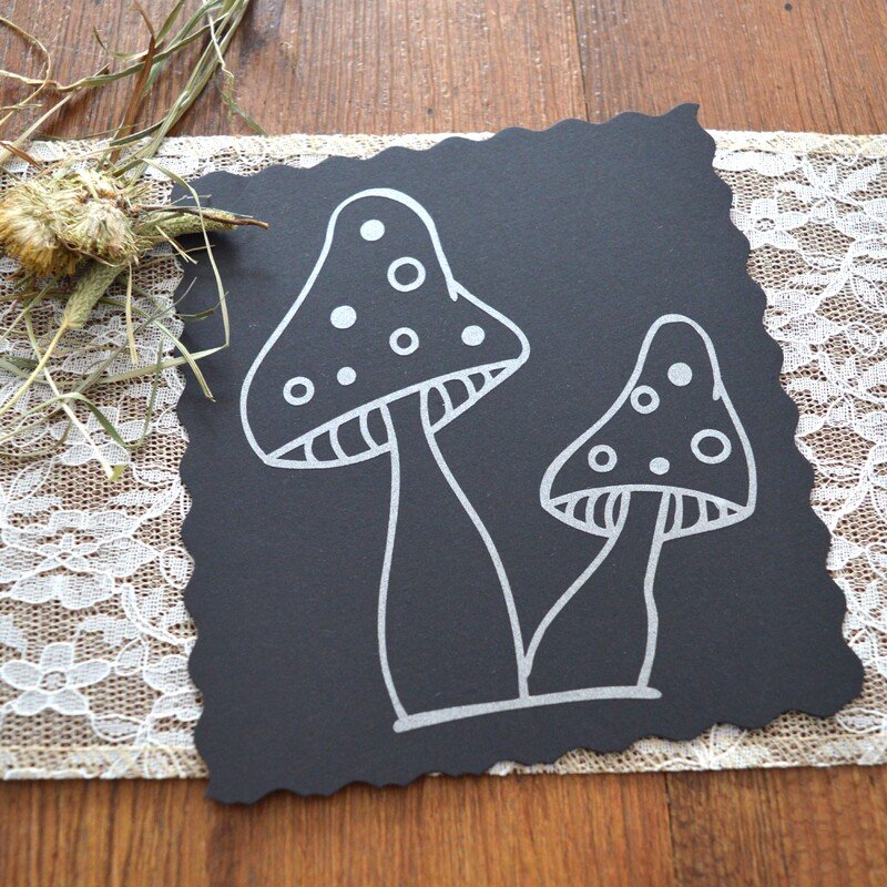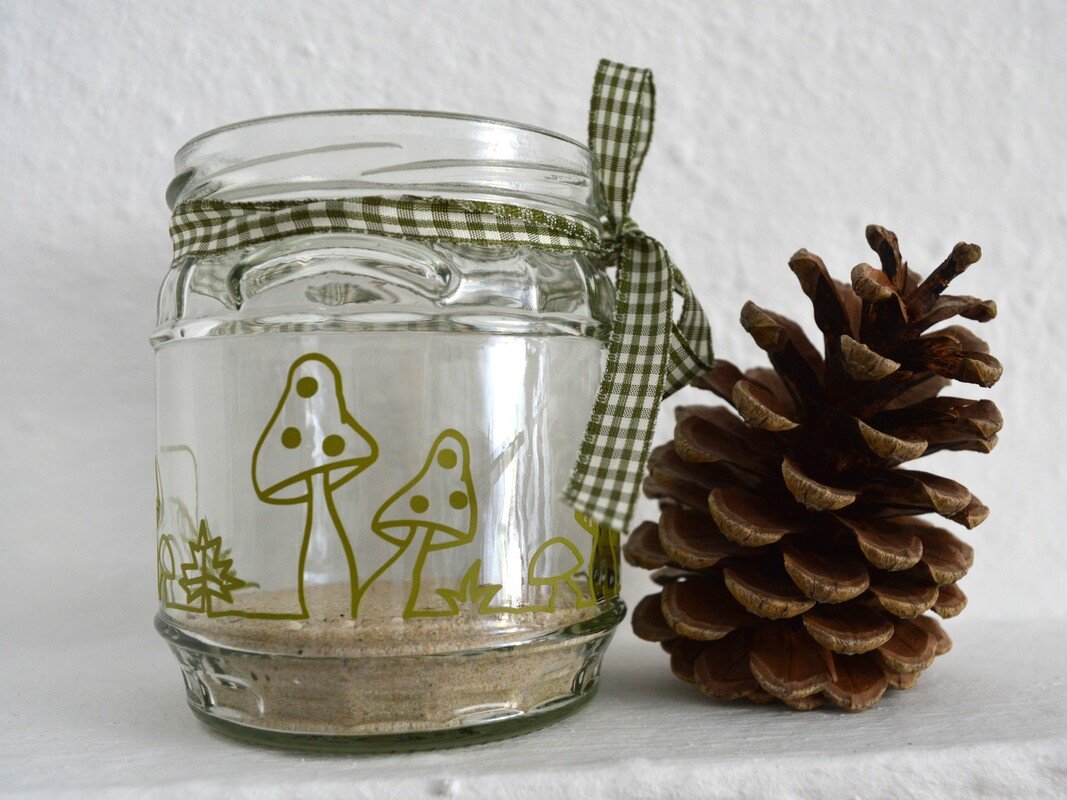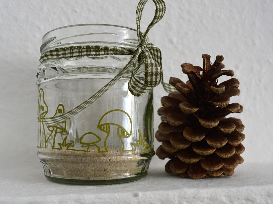 Geschnitten aus Vinylfolie verzieren die Pilze Gläser und Porzellan und alle weiteren, glatten Oberflächen oder auch Karten und Brotzeitbrettchen.