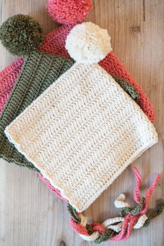 Sensitiva (100 % Schurwolle, LL = 185 m/50 g) von Schulana: pro Mütze je 50 g Pancake (Fb 34), Himbeere (Fb 23) oder Military (Fb 33) von Schulana; Häkelnadel 3 mm.