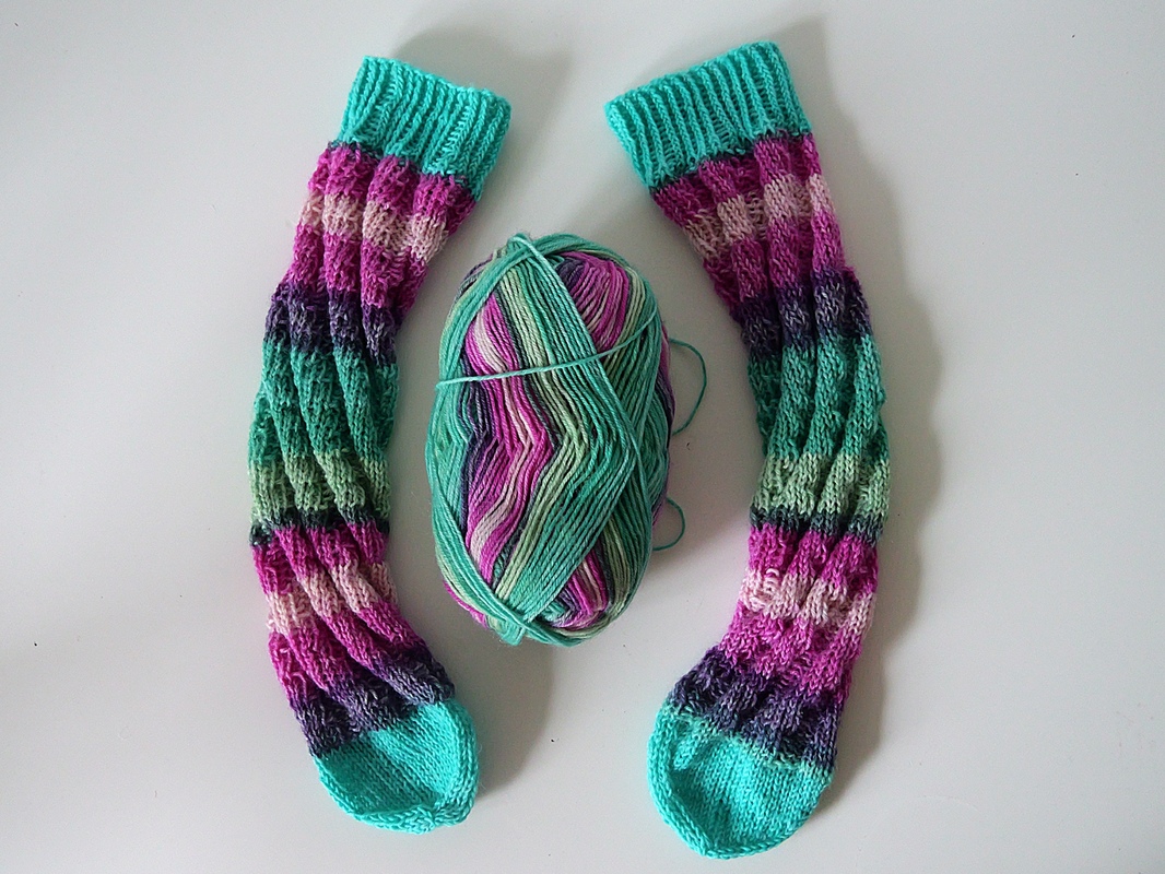Spiralsocken sind durch das Rippenmuster sehr dehnbar, so dass für mehrere Größen die gleiche Maschenanzahl verwendet werden.