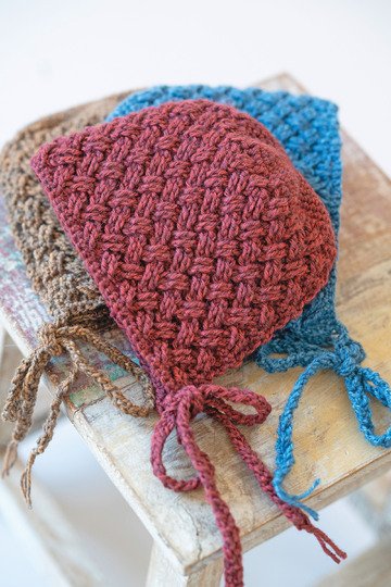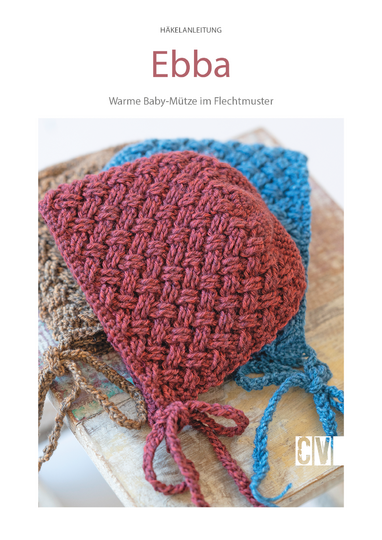 Merino 160 exp Color (100 % Schurwolle, LL = 160 m/50 g) von Austermann: pro Mütze je 100 g Borke (Fb 1217), Granat (Fb 1213) oder Denim (Fb 1214); Häkelnadel 3,5 mm.