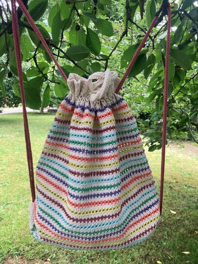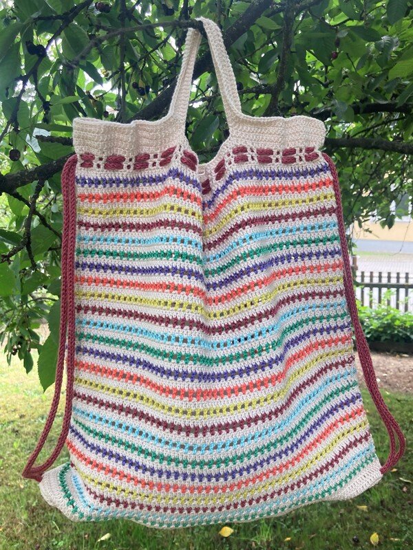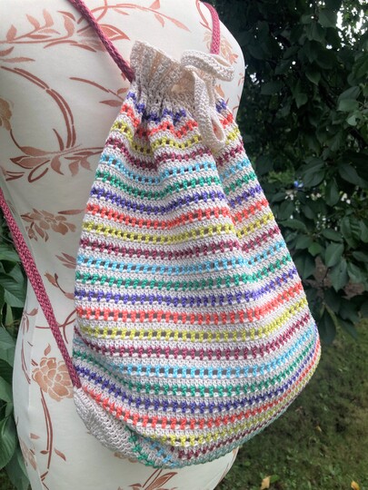 Für diesen Rucksack habe ich mir ein einfaches und verspieltes Muster einfallen lassen. Die bunten Farben sorgen für Gute-Laune bereits beim Häkeln und natürlich auch später, wenn Du Deinen selbst gehäkelten Rucksack trägst.