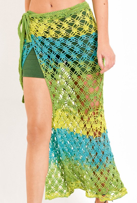 Wie ein Pareo ist dieser außergewöhnliche Wickel-Rock zu tragen. Allerding, mit dem Bund und Bindebändern in der Taille sitzt er besonders gut und kann nicht verrutschen. Gehäkelt wird von unten nach oben. Der Farbverlauf erscheint in Streifenoptik und gibt dem Muster noch mehr Pepp. Für die Formgebung muss an den Seitenlinien abgenommen werden. Dafür sollte mach einen originalgroßen Papierschnitt anfertigen. Tipp: diesen an den Seitenlinien aufschneiden. So können durch Auflegen der Arbeit die Abnahmen noch besser bestimmt werden. Am besten ist es bei diesem Muster innerhalb der Luftmaschen abzunehmen. Du häkelst mit Nadel Nr 3,5 und Garn von LANGYARNS. Die Anleitung gilt für die Größen 38, 40, 42, 44, 46 und 48.