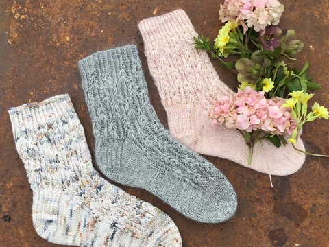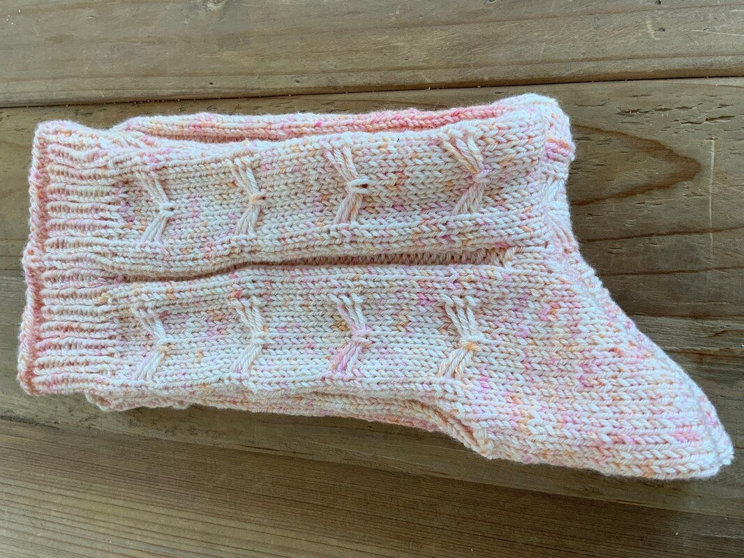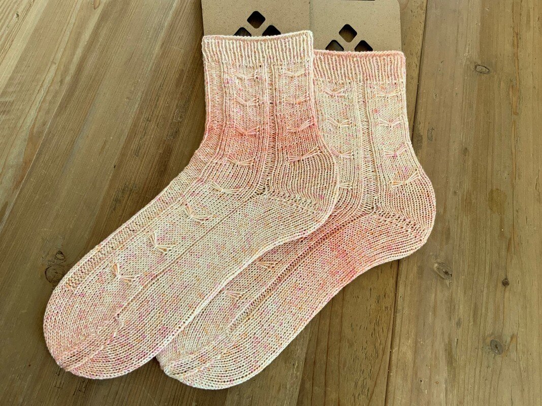 „Benoite“ sind peppige Socken mit einem einfachen Phantasie-Muster. Die Socken werden von oben nach unten gestrickt. Ich habe die Ferse als Bumerangferse gearbeitet und eine Bandspitze gestrickt und beschrieben. Ferse und Spitze können jedoch auch anders ausgeführt werden.