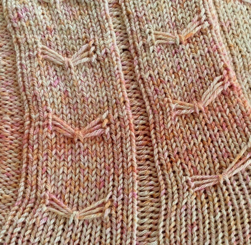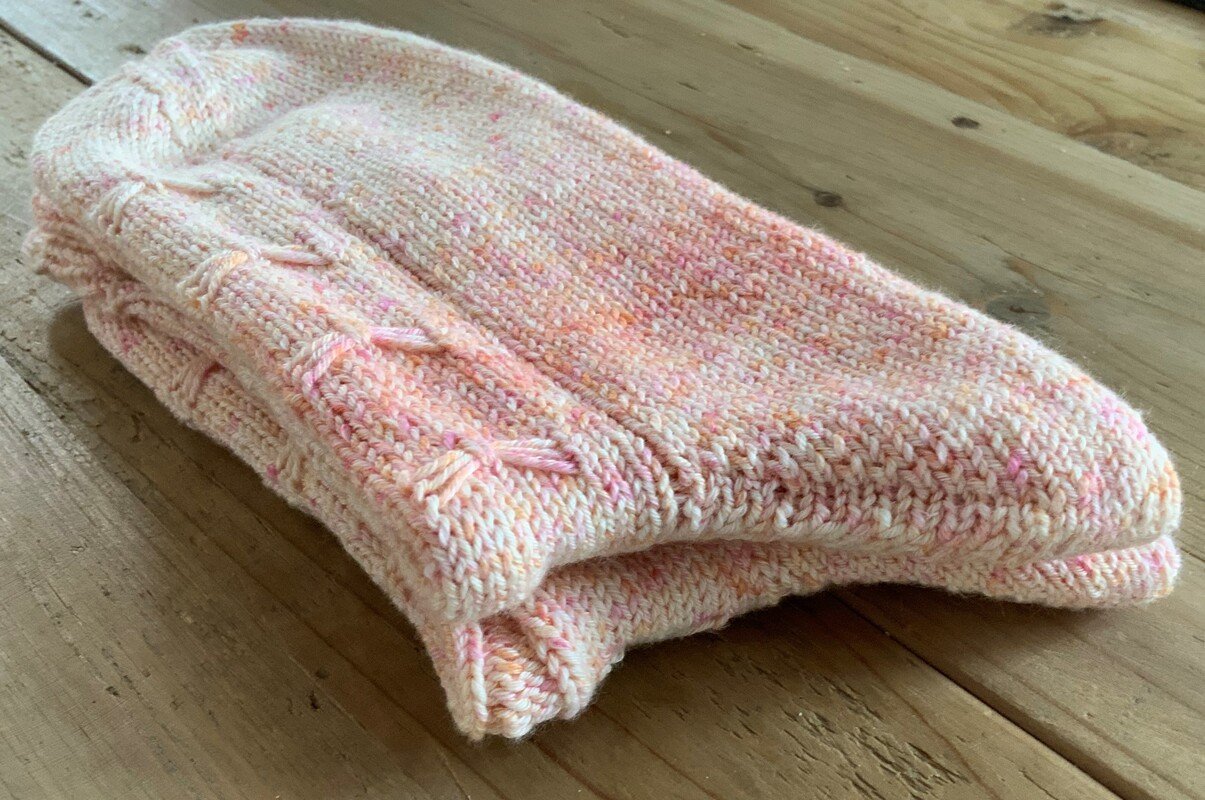 Die Mustersocken sind aus Sockenwolle von Lana Grossa , Meilenweit – Cotone Vegano Risotto, in der Farbe 1502 apricot-rosa-gelb [76% Baumwolle, 14 % Polyamid, 10% Polyester], Maschenprobe: 32 Maschen, 44 Reihen glatt rechts