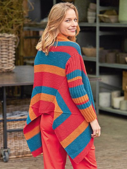 Du hast Lust auf etwas Ausgefallenes, das trotzdem leicht zu stricken ist? Dann bist du hier genau richtig. Diese dreifarbe Zipfel-Jacke hat einen ganz besonderen Schnitt, der aber total einfach nachzuarbeiten ist. Dabei hilft dir der genaue Schnitt und die detaillierte Beschreibung der Arbeitsschritte in der Anleitung. Auch die Streifenfolge ist hier eindeutig beschrieben. Das macht das Nacharbeiten zum Kinderspiel. Das Rückenteil und die beiden Vorderteile werden in einem Stück gearbeitet, die einzeln gestrickten Ärmel später angenäht. Verwendet wird hier die Nadelstärke 4 und ein Garn von ONLINE. Die Anleitung kann ich der Größe 36/38, 42/44 oder 46/48 gedownloadet werden.