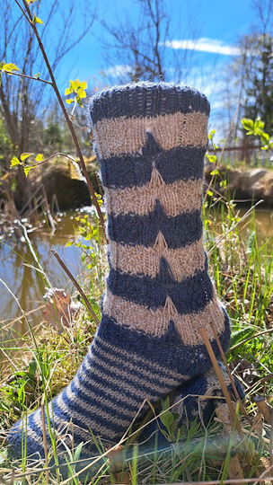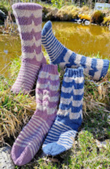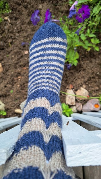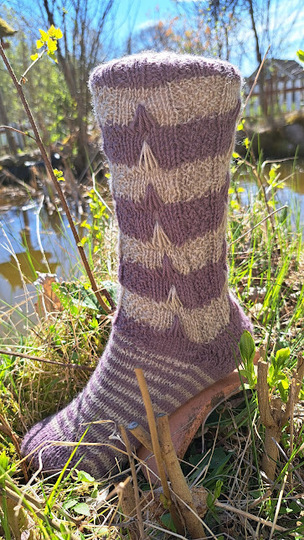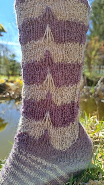 Bei diesen Socken habe ich Maschen von einer der unteren Reihen hochgezogen. Mit dieser Technik lassen sich sehr schöne Muster stricken , die man durchaus auch für Pullover anwenden kann.