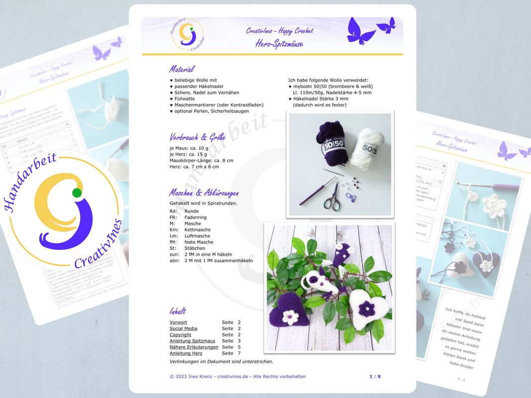 Du bekommst 3 Anleitungen in einer: für das Herz, für das Blümchen und für die Spitzmaus.