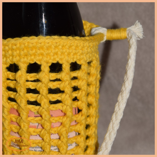 Der Flaschenhalter ist leicht zu häkeln, gewissen Grundkentnisse in den verschiedenen Häkelmöglichkeiten sind allerdings von Vorteil. :-)