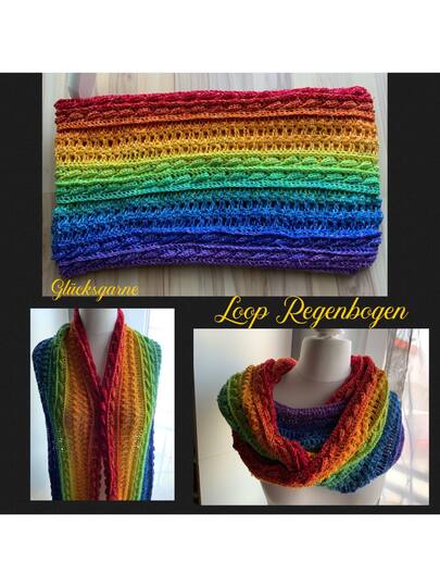 Der Musterloop wurde gehäkelt mit 1 Bobbel im Farbverlauf Farbenspiel ( erhältlich bei Glücksgarne) 1000m 4 fädig .