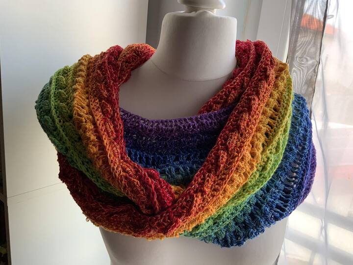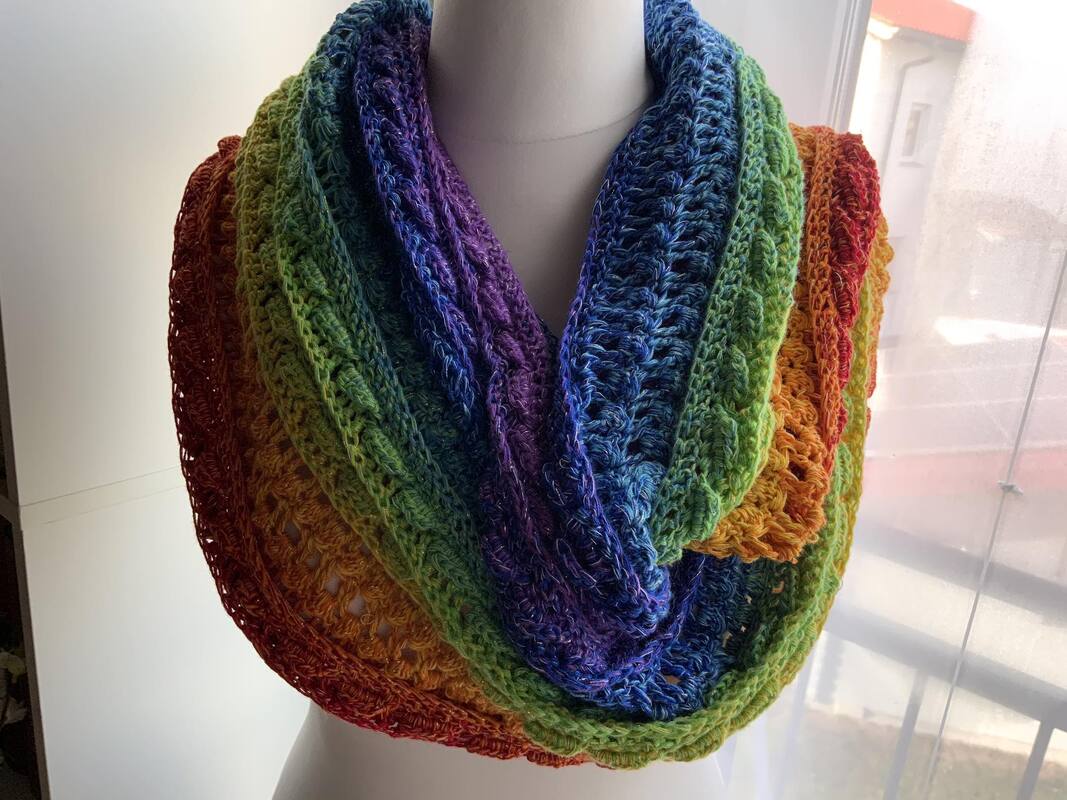 Der Loop sieht in allen Farben schön aus und muss nicht zwingend in Regenbogenfarben gehäkelt werden.