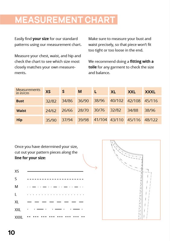 Die Größen XS-XXXL sind als Schnittmuster enthalten. Die genauen Maße der Größen könnt ihr der Größentabelle in den Bildern entnehmen.