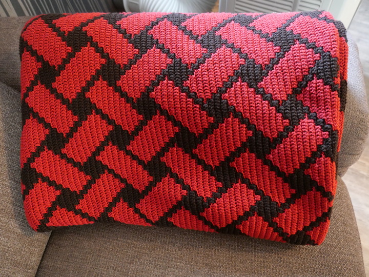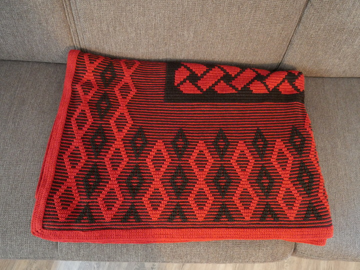 Diese wunderschöne Decke wird in der Mosaik-(Overlay)-Technik gehäkelt. Der Abschluss bildet ein doppelter Rand, so dass fast keine Fäden vernäht werden müssen.