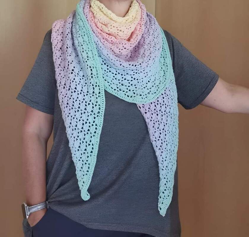 Du bekommst hier eine Häkelanleitung für flaches Dreieckstuch. Das Tuch Restina eignet sich für alle Garne, auch für buntes oder meliertes Farbverlaufsgarn sowie Cakes. Es ist leicht zu häkeln, das Muster ist schnell im Kopf und ist Anfänger- und Fernsehtauglich.