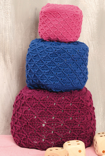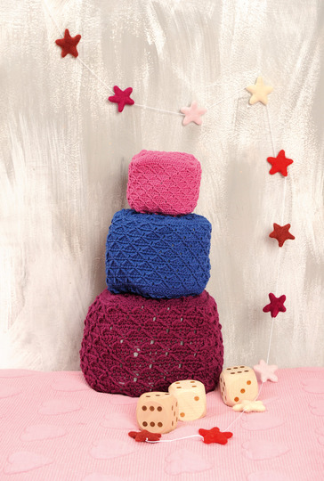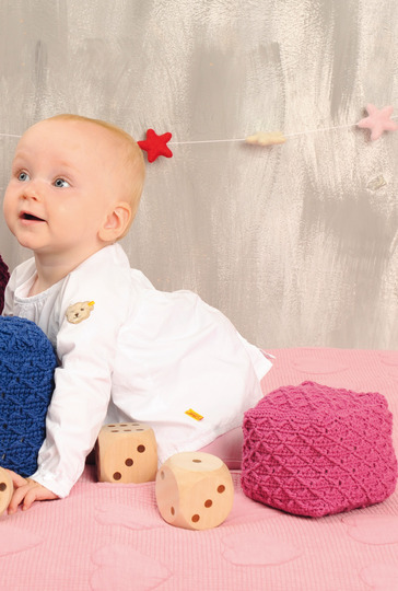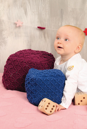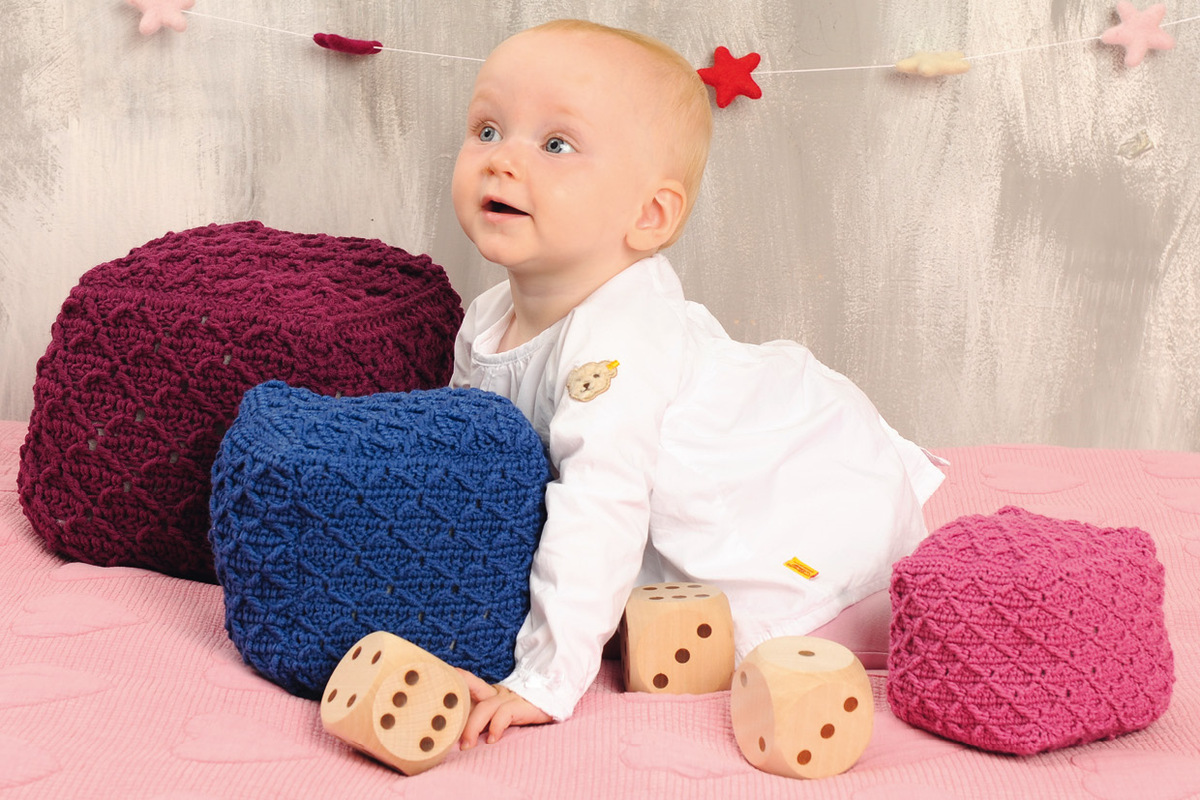 Ein buntes Würfelset das es in sich hat. Hiermit kann Ihr Baby die haptische Wahrnehmung spielerisch trainieren. Die Farben Blau, Rot bis hin zu Pink fördern dazu die visiullen Reize. Das Rautenmuster der Würfel ist gehäkelt. Das Beste daran: Alle drei Würfel werden nach derselben Anleitung gearbeitet. Der Trick dabei: Die Garne sind unterschiedlich dick und ergeben so Würfel in unterschiedlichen Größen. Die Anleitung lässt sich wunderbar leicht nacharbeiten in den Würfelgrößen 10x10 cm, 15x15 cm und 20x20.