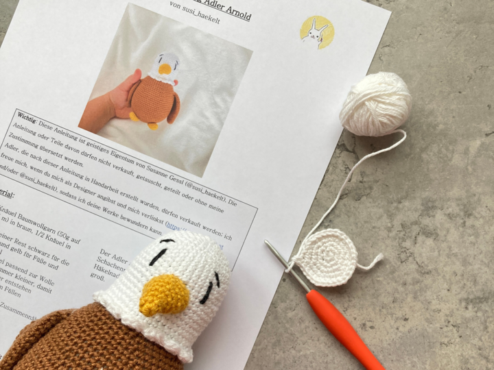 Adler, die nach dieser Anleitung in Handarbeit erstellt wurden, dürfen verkauft werden. Ich freue mich, wenn du mich als Designerin angibst und mich verlinkst (https://susi-haekelt.at oder @susi_haekelt.at).
