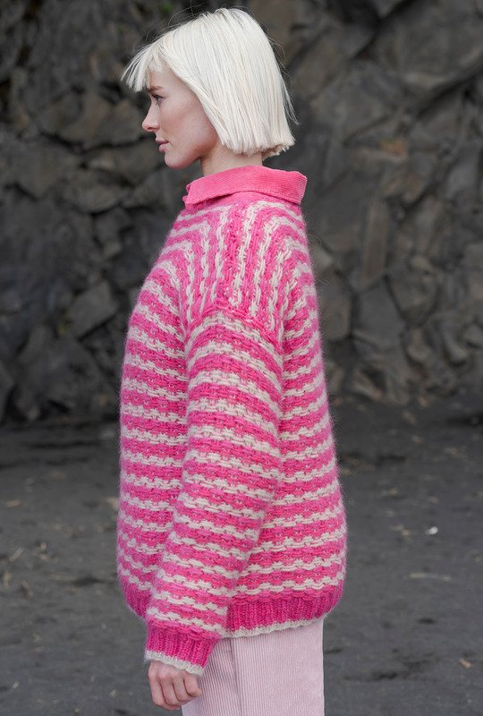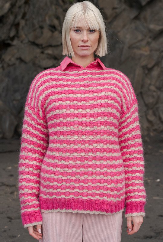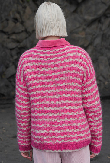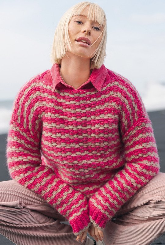 Wie gewebt erscheint hier die Musteroptik der Hebemaschen, da du die unbenutzten Fäden immer auf der Vorderseite der Arbeit mitlaufen lässt. Spannende Farbakzente setzt das Spiel von leuchtendem Pink und neutralem Beige – ein toller Effekt, der die Balance zwischen knallig und reduziert in den Fokus rückt. Der lässige Pulli besteht ganz klassisch aus vier Teilen, die unten durch Rippenbündchen eingefasst sind. Der Halsausschnitt wird zum Schluss einfach mit einer Runde Kettmaschen umhäkelt – das geht schnell und hat den Effekt der Stabilität.