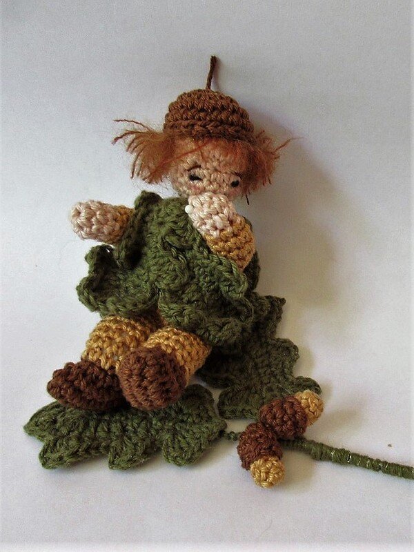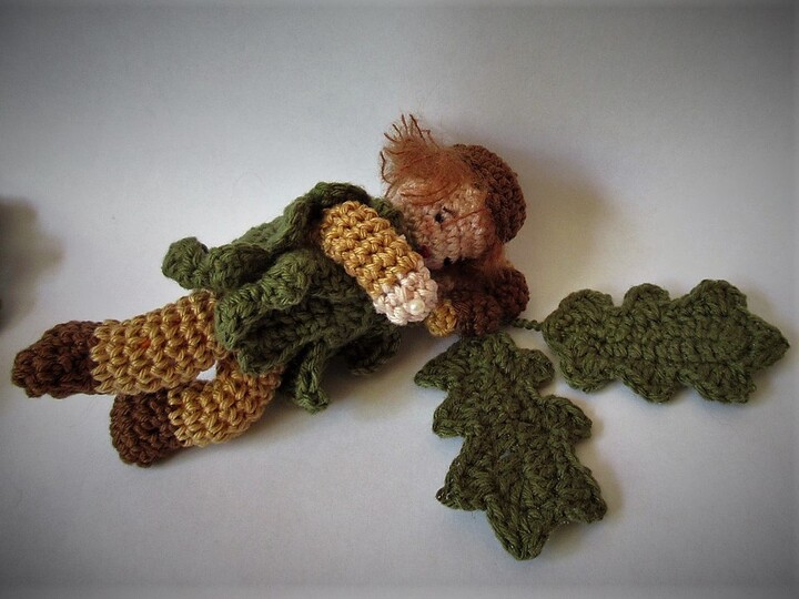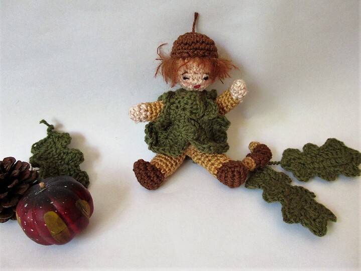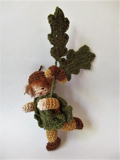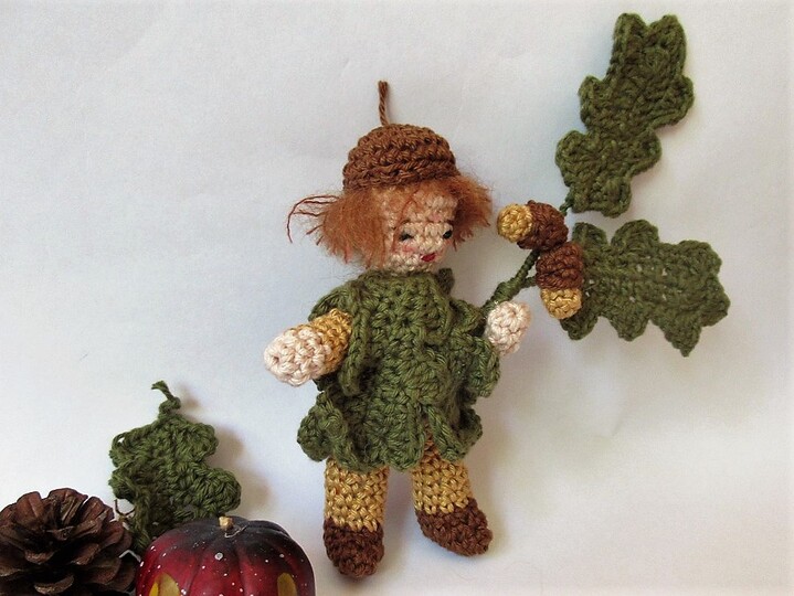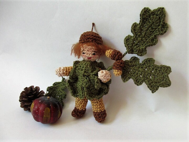Das kleine Püppchen eignet sich hervorragend als kleine Herbstdekoration auf der Fensterbank. Es hat biegsame Arme und Beine, so dass du es in ganz verschiedenen Positionen dekorieren kannst. Es trägt ein Kleid aus Eichenblättern und auf dem Kopf eine braune Kappe. Im Arm hält es einen Eichenzweig.