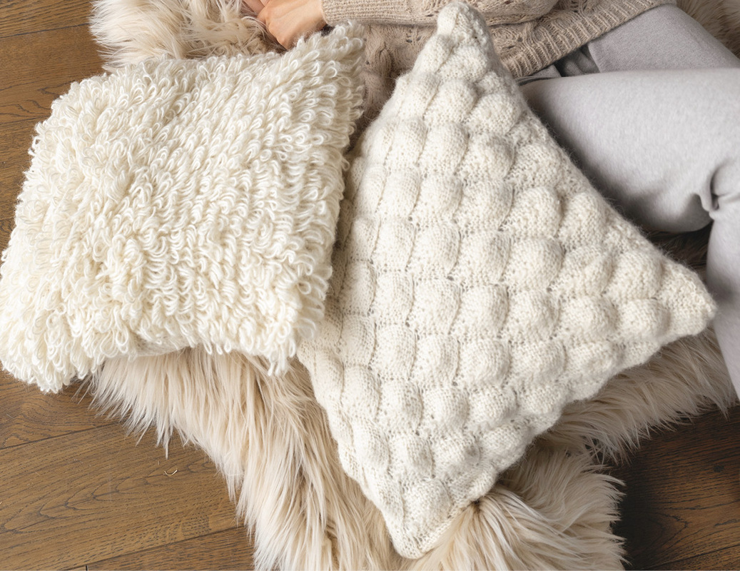 Ob gehäkelte Schlaufen oder gestrickte Noppen – mit diesen beiden Kissen machen wir es uns an kalten Tagen so richtig gemütlich. Bei den Schlingen kommt nicht nur deine Häkelnadel zum Einsatz, sondern auch dein Mittel- und Ringfinger, um die du den Faden legst. Für das großflächige Noppenmuster haben wir für dich in unserer Anleitung eine Strickschrift gezeichnet. Beide Kissen werden in Quadratform angefertigt, mit einem Inlet gefüllt und zum Schluss an den Seiten zusammengenäht.