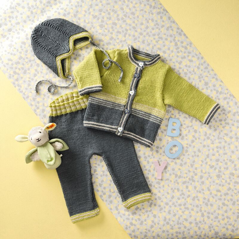 • Woolly Hugs CHARITY (75 % Wolle, 15 % Polyamid, 10 % Polylactid, Lauflänge ca. 100 m/50 g) von L&K für das Jäckchen 150 (200) 250 g Kiwi (Farbe 74), 50 (100) 100 g Stein (Farbe 90) und 50 g Weiß (Farbe 01); für die Hose 200 (250) 250 g Stein und je 50 g Kiwi und Weiß; für das Mützchen 50 g Stein und je 1 Rest Kiwi und Weiß