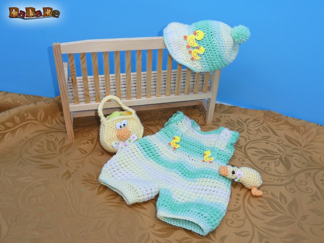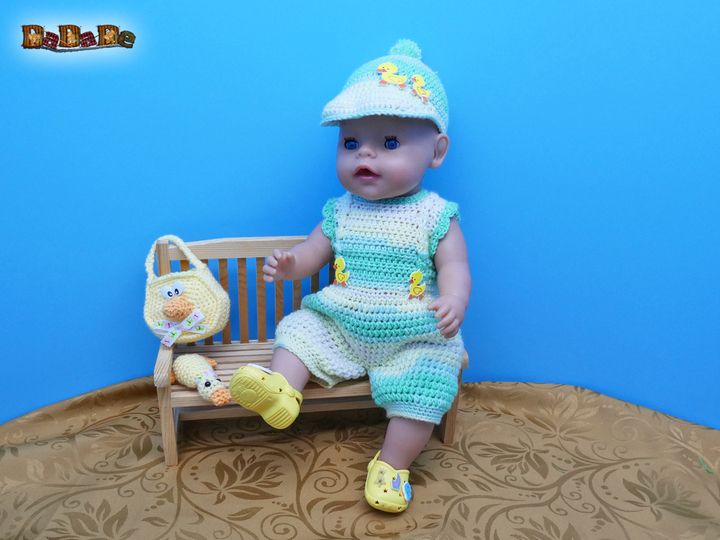 mit Hosen-Anzug, Mütze, Tasche und putzigem Entchen. Auch Püppis brauchen was zum Kuscheln.