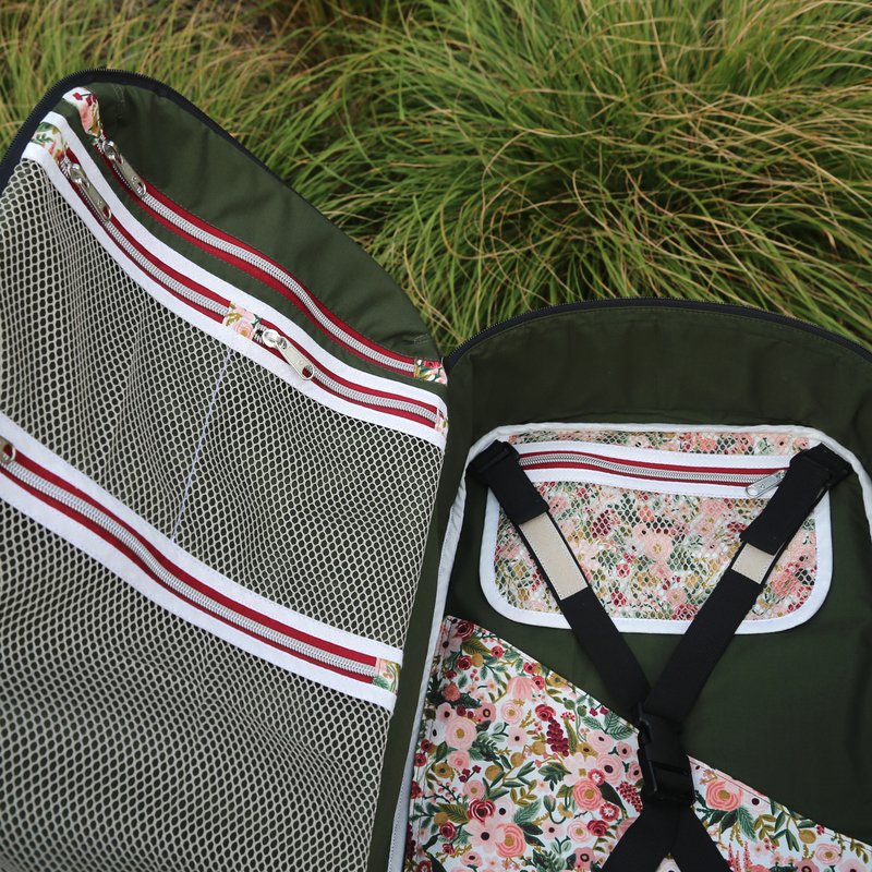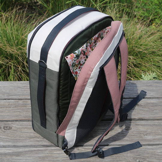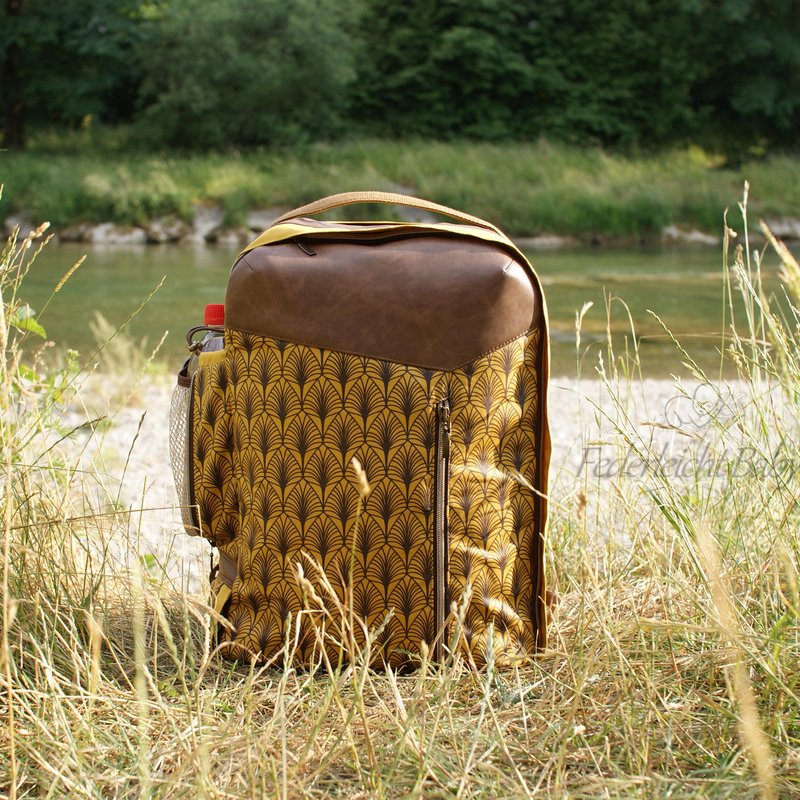 Veiiko ist als Reiserucksack konzipiert und kann mit seinen Maßen von ca. B 31cm x H 45cm x T 16cm auch wunderbar als Handgepäck mit ins Flugzeug genommen werden. Er ist unterteilt in ein großes Hauptfach und ein separates Laptopfach. Wie du die Tiefe des Hauptfachs vergrößern/verkleinern kannst, erkläre ich dir im Ebook. Bei Bedarf kannst du auf das Laptopfach verzichten, so ist es deutlich einfacher zu nähen. Veiiko ist so gestaltet, dass er sowohl vertikal (als Rucksack) als auch horizontal (als Schultertasche oder auf den Koffergriff gesteckt) verwendet werden kann. Alle Fächer und Funktionen sind dahingehend optimiert.