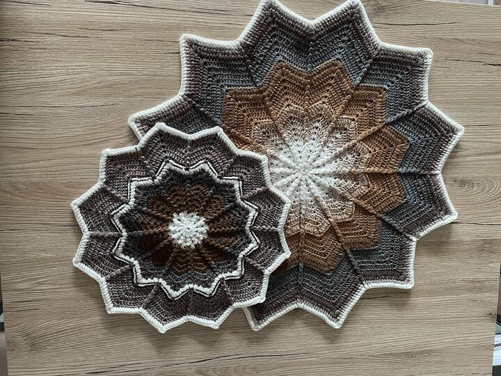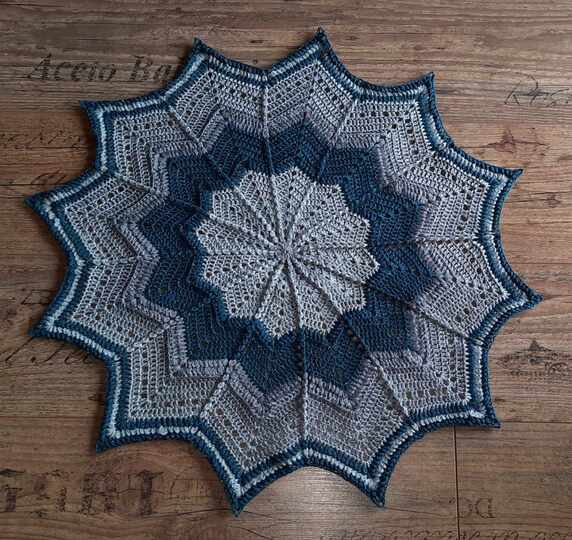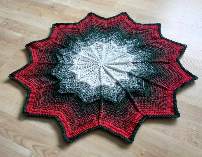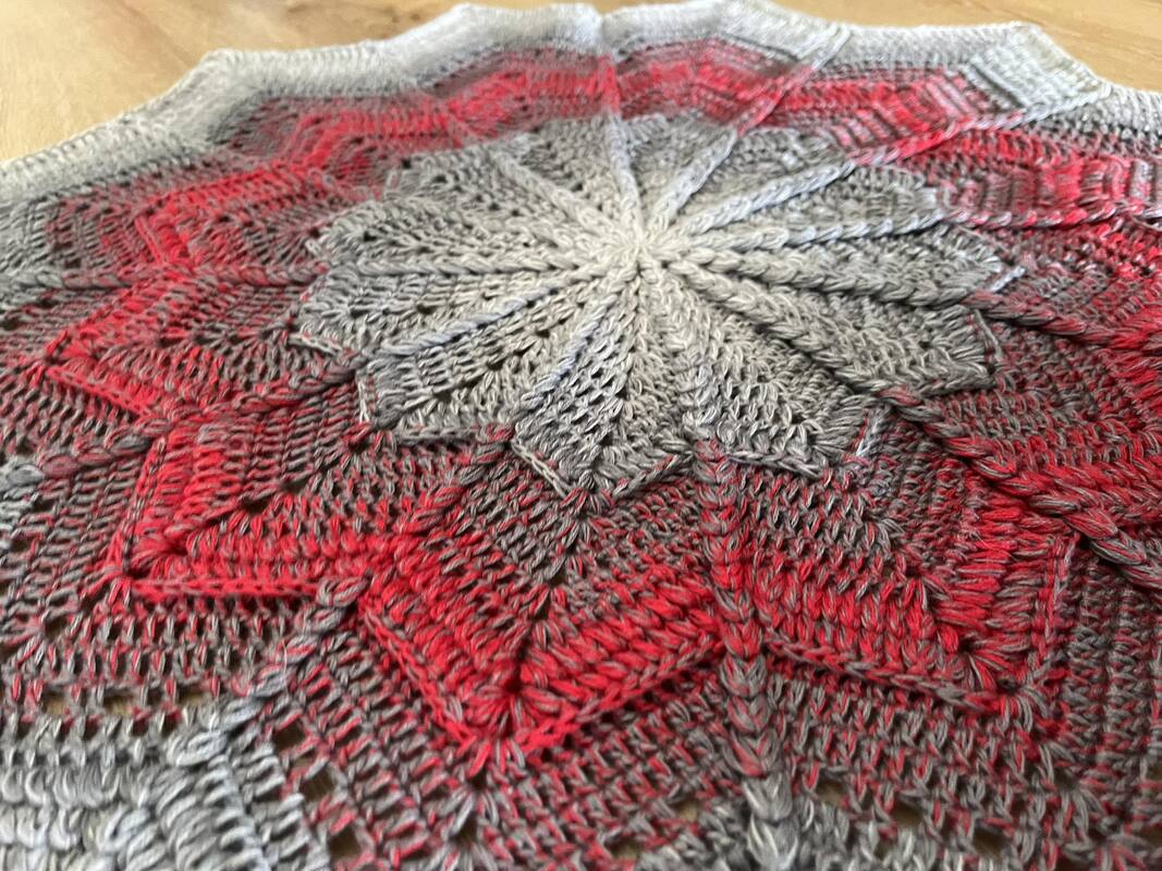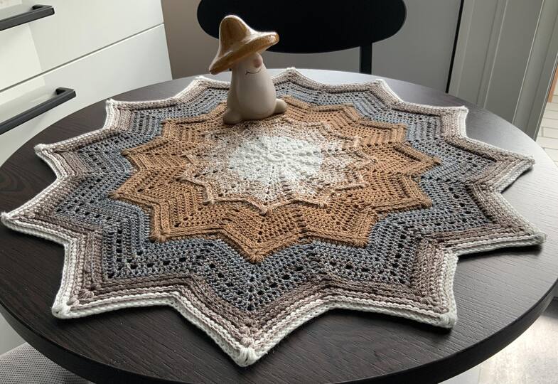 Das Sternchen ist eine wunderbare Tischdeko und passt mit ca 65cm auch auf kleine Tische. Nicht nur zu Weihnachten, auch mit einem buntem Strauß Frühlingsblumen drauf, ist er ein Hingucker. Das häkeln ist abwechslungsreich und wird nicht langweilig, es ist aber auch nicht so kompliziert das man dabei nicht Fernsehn schauen oder sich unterhalten kann. Die Anleitung ist verständlich geschrieben und beinhaltet Bilder, Text und Häkelschrift. Es ist auch für Anfänger machbar, nur die Büschelmaschen könnten eine kleine Hürde sein. Aber man wächst mit seinen Aufgaben. Passendes Garn findest du z.B. bei GeWolltes-die Gruppe auf facebook.