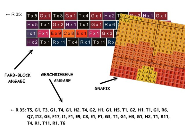 -vergrößerte farbige Grafik auf 4 Seiten mit Buchstaben (Symbolen)