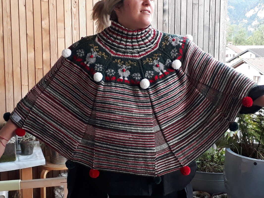 Der Poncho wird in Runden von oben nach unten gestrickt. Die Bordüre ist in Double Face gestrickt. Du solltest unbedingt schon Kenntnisse im Double Face stricken haben! Es ist KEIN Grundkurs in der Anleitung enthalten.