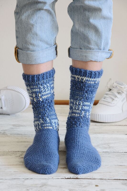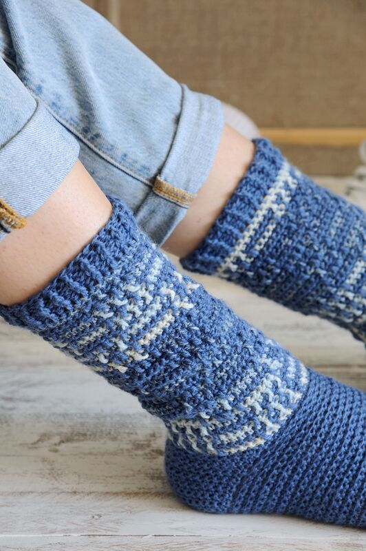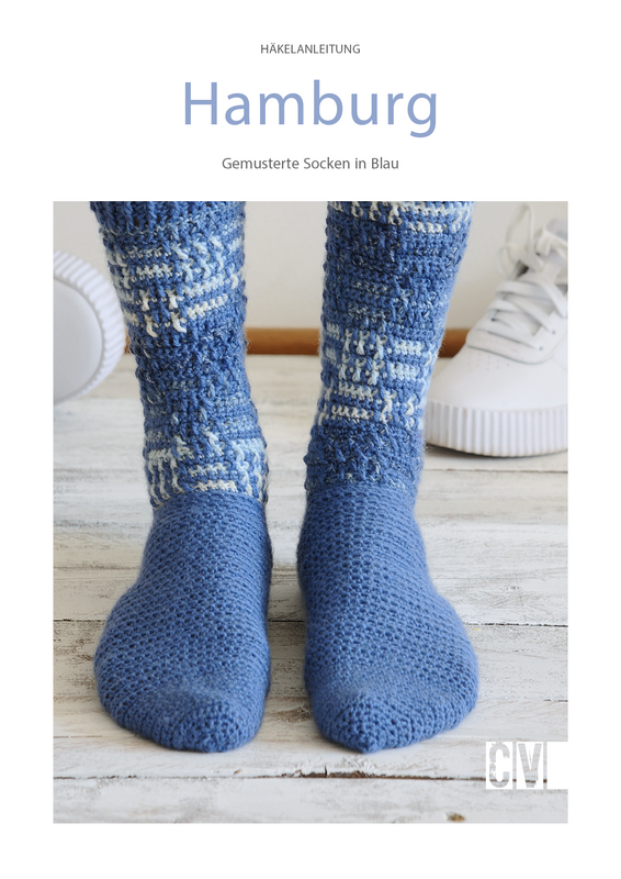 Diese Socken erinnern an nichts außer blaues Wasser, Meer und die verschiedenen Farbtöne der Weltmeere! Ein absoluter Traum in Blau. Das besondere an ihrem Design ist, dass die Socken am Fuß zwar in einem einfarbigen Blau gehäkelt werden, der Bund jedoch dann eine spannende Melierung hat und besonders hoch ist. Dadurch bekommen die Socken ihren ganz eigenen Charakter! Sie sind einfach nach dem 4-Stufen-Prinzip zu häkeln.
