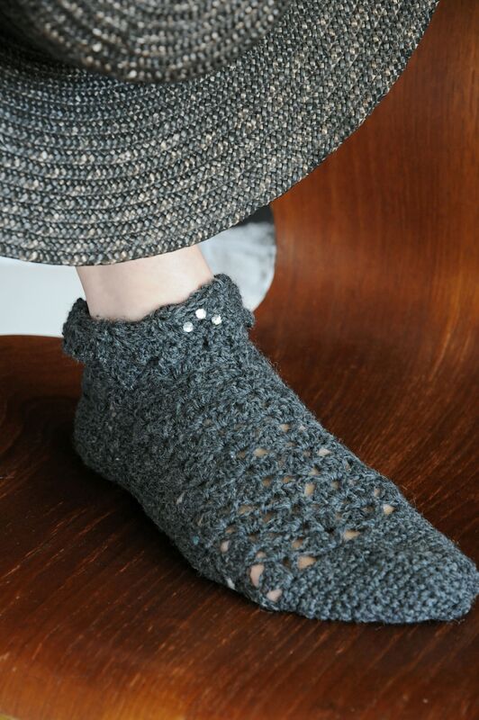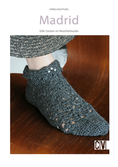 Diese Socken sind mal was anderes - Sowohl der Schnitt als auch das Muster erinnern nicht an eine klassische Socke. Die Socken sind kürzer geschnitten, werden im Muschelmuster gehäkelt, wodurch sie eine leicht löchrige Struktur bekommen, und werden von dezenten Glitzersteinen verziert. Eine tolle Alternative zu normalen Alltagssocken! Die Socken können auch gut zu schickeren Anlässen getragen werden oder verschenkt werden!
