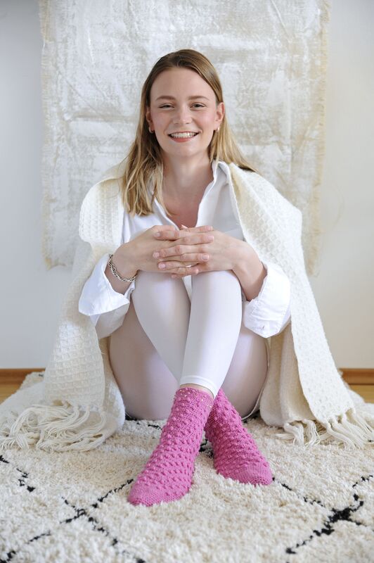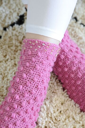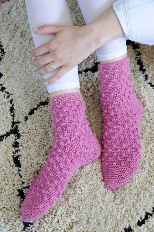 Ein Traum in Rosa - Das beschreibt diese Socken doch schon ganz gut! Dieses Modell ist einzigartig auf seine ganz eigene Art und Weise. Es wird in einem knalligen Pink gehäkelt, und hat auf der ganzen Oberfläche kleine Noppen, die aussehen wie Mini-Pompons. Der Saum wird von kleinen perlen geschmückt, wodurch der verspielte Look nochmal verstärkt wird. Die Socken eignen sich super im Alltag aber auch für schickere Anlässe!