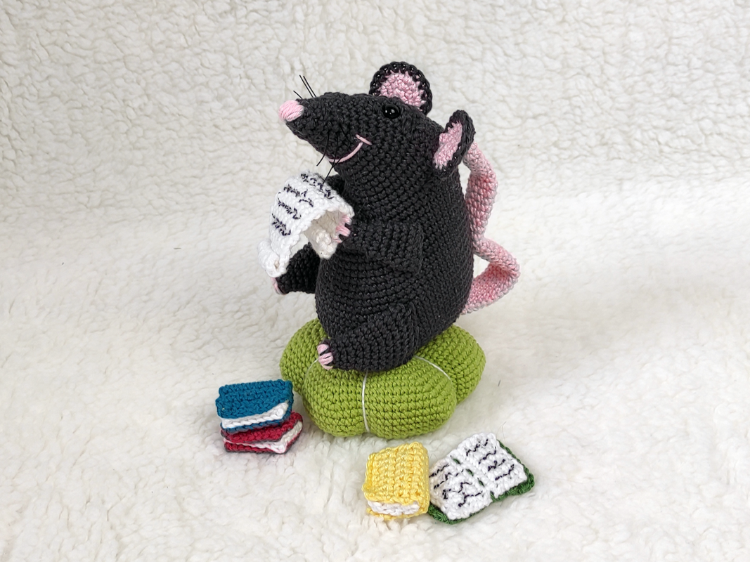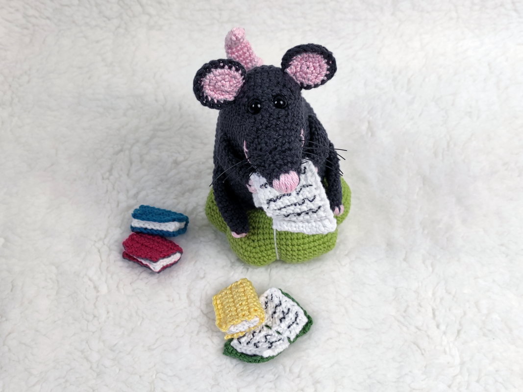Mit dieser Anleitung kannst du die kleine Leseratte mit ihren Büchern und ihrem Kissen nacharbeiten.