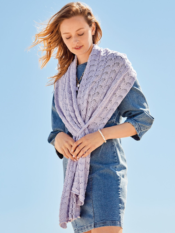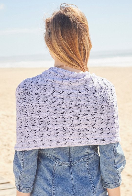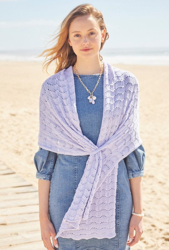 Das Tuch im Wellenmuster kann mehrfach um den Hals geschlungen werden, für mehr Wärme. Dank des tiefer angelegten Cut-outs, durch das das andere Ende des stolaförmigen Tuchs gezogen wird, kann es auch dekorativ um Hals und Schultern gelegt werden, ohne dass es verrutscht. Das Muster ist auch für AnfängerInnen mit ein wenig Strickerfahrung geeignet. Die Flieder-Farbe des Baumwolle-Viskose-Mischgarns wirkt sehr feminin. Es steht eine Anleitung für ein Tuch in der Größe 49,5 x 150 cm zur Verfügung.