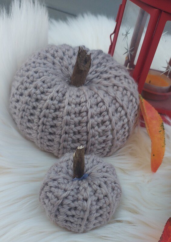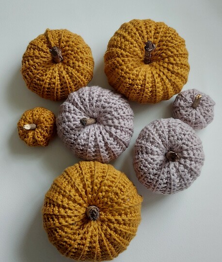 Kürbisse haben die Größen 12, 9 und 6 cm, falls anderes Garn verwendet wird, kann die Größe anders ausfallen.