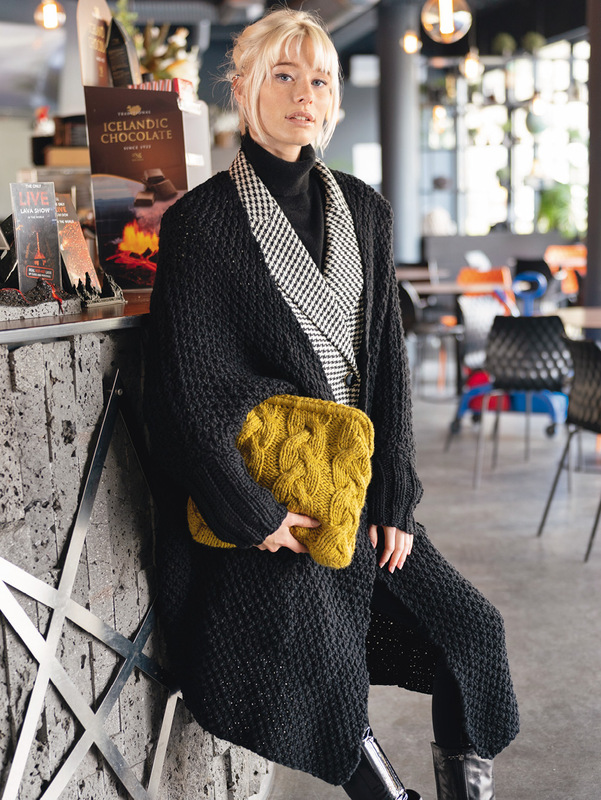 Gemacht für den lässigen Everyday-Look ist dieser verschlusslose Mantel immer ein Blickfang. Mit dicker Schurwolle geht die Arbeit im großen Perlmuster schnell von der Nadel – da kann man sich auch an die voluminöse Schnittform wagen, die zweifelsohne zur stylischen Note beiträgt. Eingearbeitete Taschen und hohe Rippenbündchen für die Ärmel machen den Stil perfekt. Wer Lust hat, komplettiert den Look mit einer handgestrickten Tasche in Curry, bei der insbesondere die dicken Zöpfe Aussehen erregen. Ein Klappverschluss und zugenschnittenes Innenfutter geben Halt und Stabilität.
