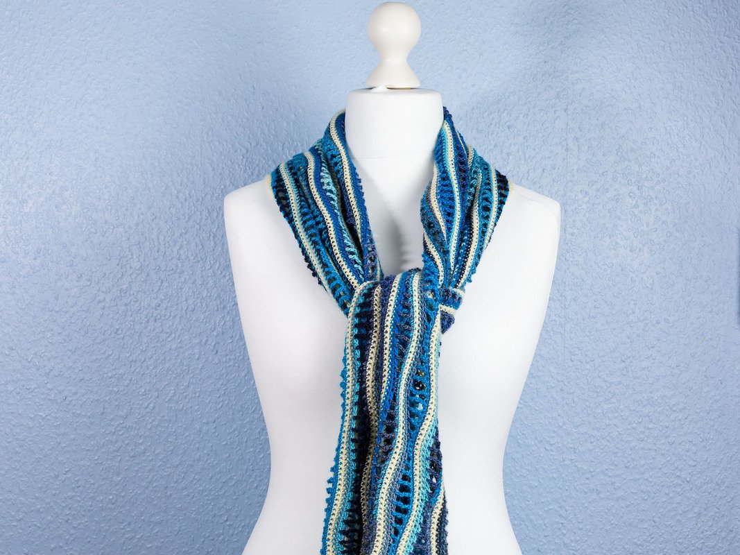 Der fertige Schal hat ungespannt eine Länge von ca. 186 cm und eine Höhe von ca. 30 cm, gearbeitet mit Häkelnadel Nadelstärke 3,5 mm.