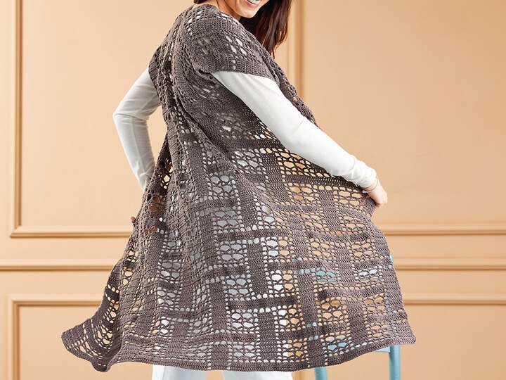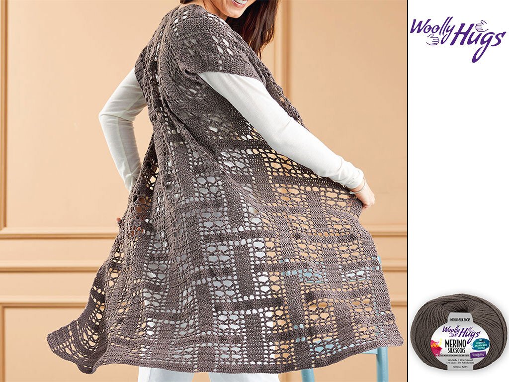 Diese Longweste ist ein echter Hingucker und passt zu jedem Anlass. Sie ist aus einem fantastischen Garn aus Seide und Merinowolle gestrickt und hat ein tolles Muster. Die Weste ist leicht zu häkeln und das Garn gibt es in vielen tollen Farben.