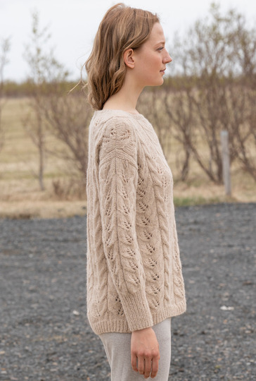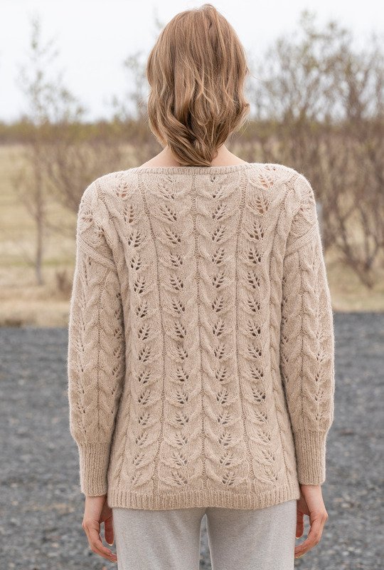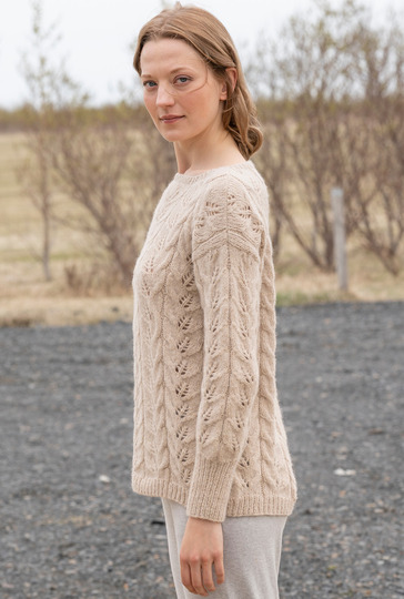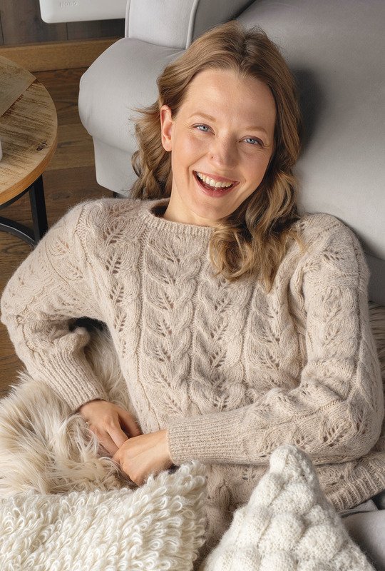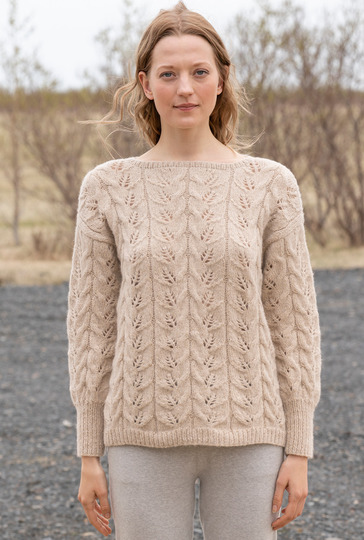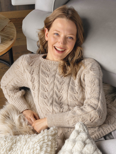Ein Mischgarn aus Alpaka und Baumwolle ist genau das Richtige für den Übergang und lässt jedes Muster toll zur Geltung kommen. Bei diesem Pulli haben wir uns für Blattstreifen entschieden, die allover zum Einsatz kommen. Schmale Blenden an Vorder- und Rückenteil und hohe Bündchen an den Ärmeln – beide im Rippenmuster gestrickt – halten alles schön in Form und vermitteln die klassische Note. In neutralem Beige der ideale Begleiter, der sich jedem Modestil perfekt anpasst.
