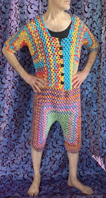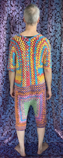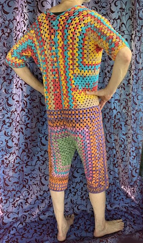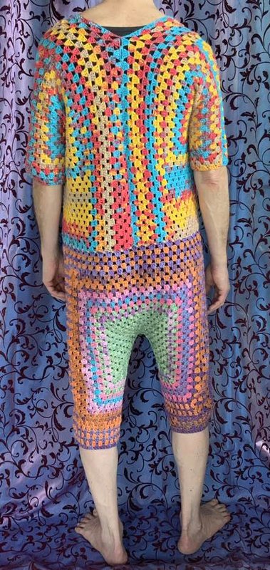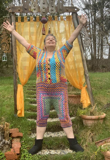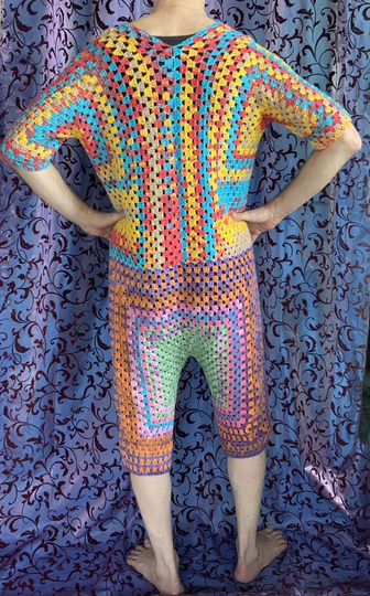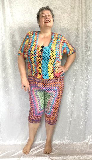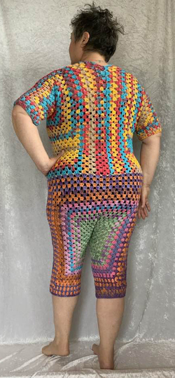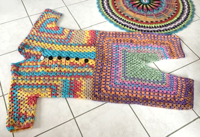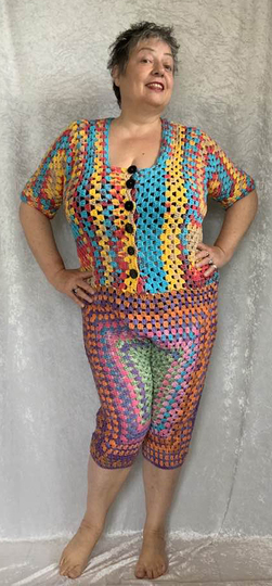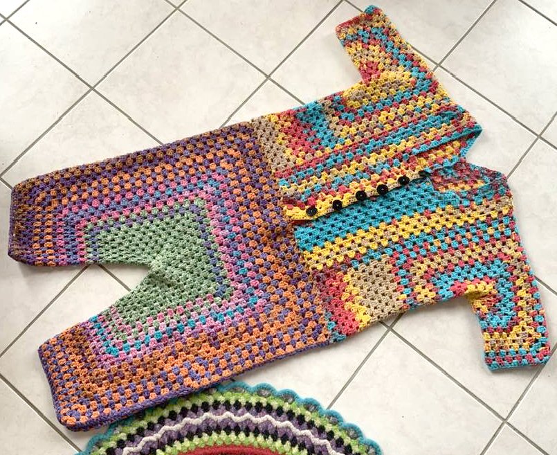( am Oberteil +) vorne zum Aufknöpfen...im Granny -Style ..und auch noch so flott gehäkelt...das bekannte Grannymuster geht ja schnell und sieht immer prima aus! Auch Super für Wollreste mit gleicher Lauflänge!