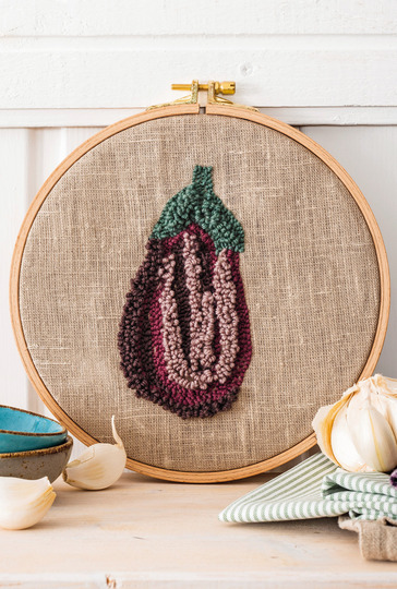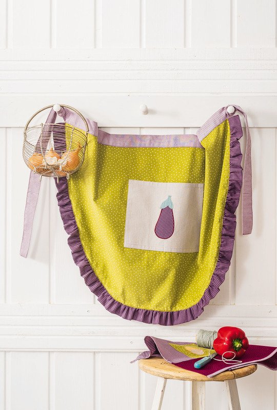 gestopft. Auf der Tasche der genähten Küchenschürze mit Rüschenkante ist eine ebenfalls Aubergine appliziert, die Punch Needle-Aubergine und -Zwiebel bringen Frische ins Küchenambiente und mit den applizierten Auberginen zeigt sich auf dem Läufer geschmackvolles Küchendesign.