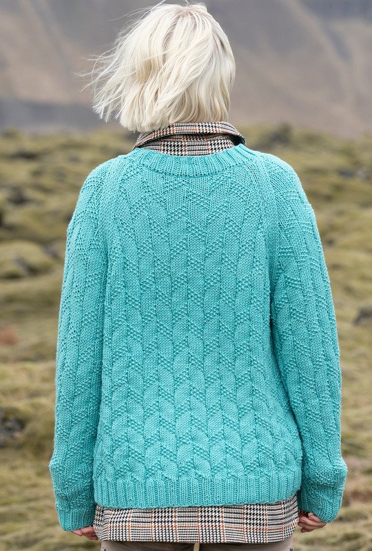 Ungeachtet der Tendenz zu mehr Weiblichkeit bleibt das grundsätzliche Bedürfnis der Frauen nach Alltagstauglichkeit bestehen. Hier zeigen wir dir einen klassisch geschnittenen Raglanpulli in kräftigem Türkis, dessen Allover-Strukturen aus rechten und linken Maschen gestrickt werden. Eigentlich nicht so schwer, da aber auch in Rückreihen gemustert wird, heißt es bei den Abnahmen für die Raglanschrägungen aufgepasst. Wir haben in unserer Anleitung eine kleine Strickschrift angefertigt, an der du dich orientieren kannst. Eine weitere Hilfe sind die Glatt-rechts-Streifen vor und nach den Abnahmen. Fertig? Dann musst du nur noch die vier Teile zusammennähen und die gerippte Halsblende anstricken.