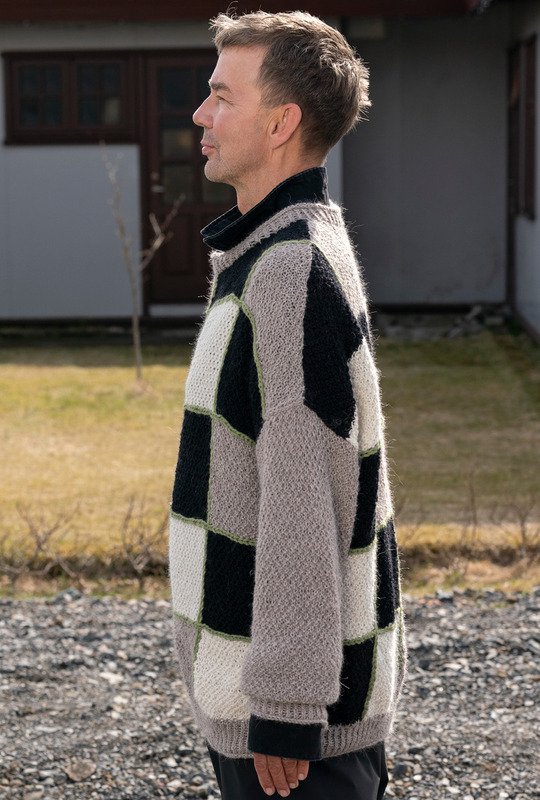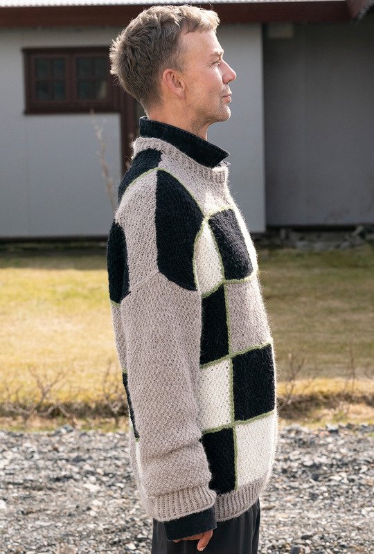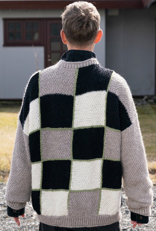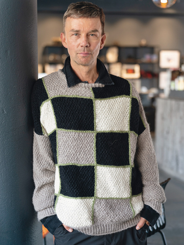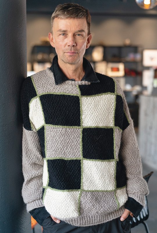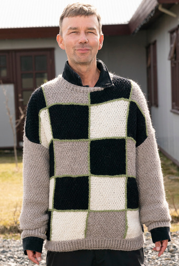 Er liebt sportliche Pullis, die sich jedem Stil anpassen. Und die aus einem weichen Alpakagarn für Wohlgefühl sorgen. Hier werden in Beige, Schwarz und Natur große Karos aus Perlmusterstrukturen angelegt. Dafür musst du für jede Fläche ein extra Knäuel verwenden und die Fäden auf der Rückseite der Arbeit verkreuzen. Die Farbübergänge werden dann später mit grünen Maschenstichen akzentuiert – das vermittelt den beliebten Patchwork-Stil. Die klassiche Form wird durch die elastischen Bündchen und den rundem Halsausschnitt erzielt.