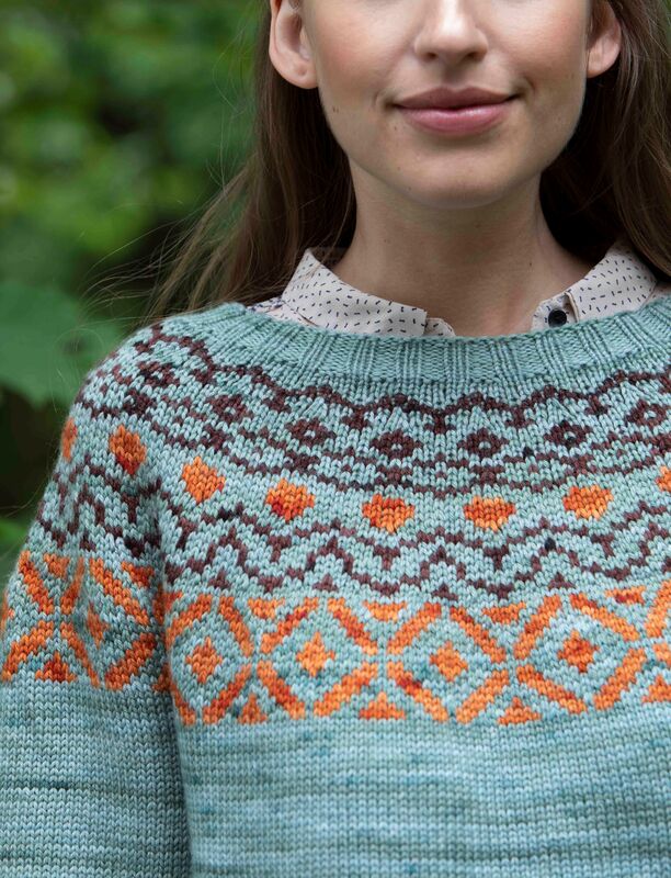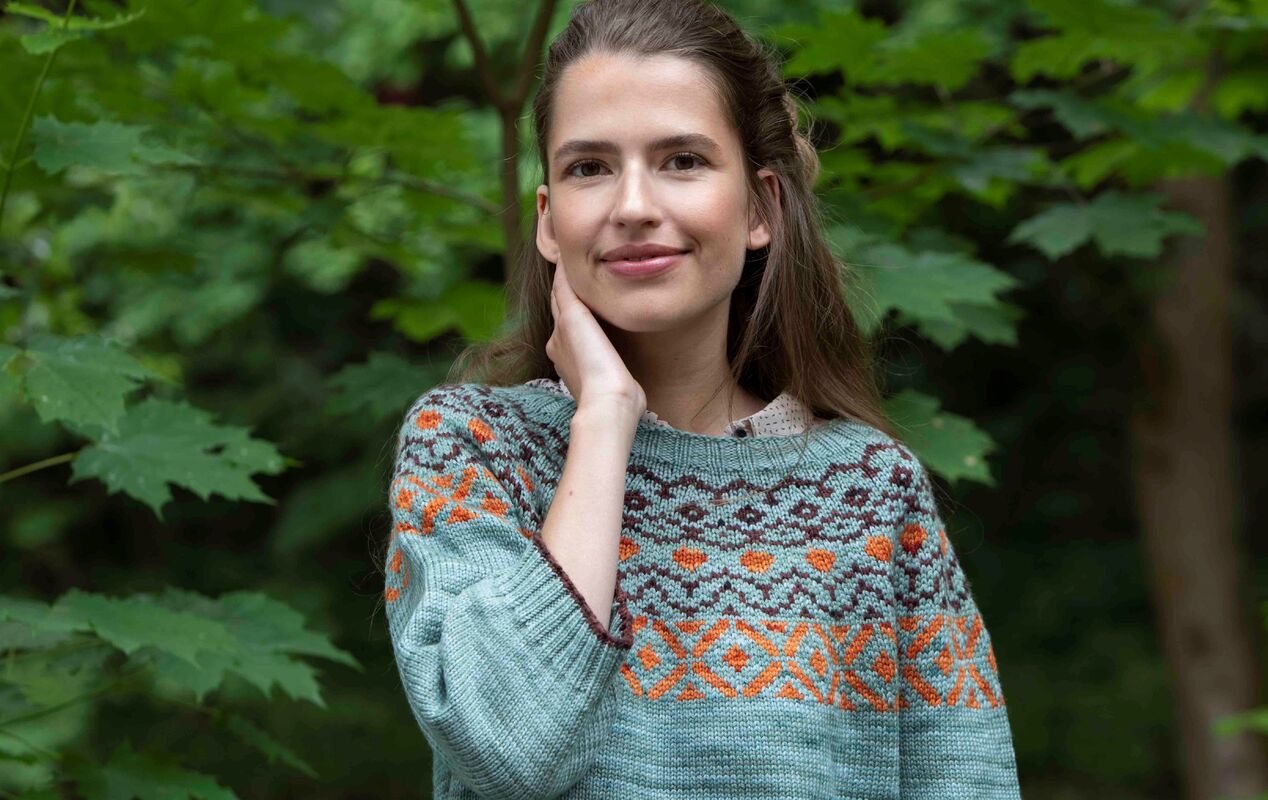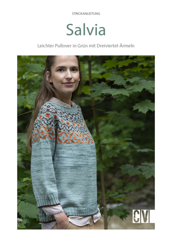 Merino DK (100 % Schurwolle, LL = 225 m/100 g) von Locoporella: 200 (200/300) g Salbei, je 100 g Fox und Chocolate; verschieden lange Rundstricknadeln 3 mm und 4 mm.