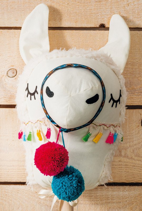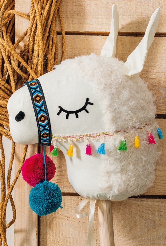 Ob zum rasanten Spiel, zum Beispiel am Kindergeburtstag, oder einfach nur zum Dekorieren – das bunt geschmückte Stecken-Lama ist ein Symbol für gute Laune und gleichzeitig Entspanntheit. Der Lamakopf wird aus Baumwoll- und Plüschstoff genäht und anschließend großzügig mit Füllwatte ausgestopft. Das reich verzierte „Zaumzeug“ für das Lama entsteht aus einer Quastenborte, Webband, Chenilledrähten und zweifarbigen Pompons. Dank der ausführlichen Nähanleitung inklusive Schnittteilen ist das Nacharbeiten des lustigen Tiers kein Problem.