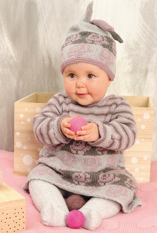 Mit diesem schicken, blümigen Outfit ist Ihr Baby für festliche Anlässe bestens gekleidet. Selbst die passende Mütze hält das zarte Babyköpfchen schön warm! Das Kleidchen besteht aus Vorder- und Rückseite und extra im Streifenmuster gestrickten Ärmelchen. Das Streifenmuster wiederholt sich auch in der oberen Passe des Kleidchens. Nach dem Zusammennähen der Strickteile werden die Säume an Ärmel, Hals und unterer Kante mit einem gehäkelten Mäusezähnrand versehen. Die passende Mütze wird mit dreifarbigen Zipfelchen gearbeitet, die sehr dekorativ aussehen. Die Anleitung gibt es für die Größen 62 – 68 (74 – 80) 86 – 92 und die Mütze hat einen Umfang von 42 cm.